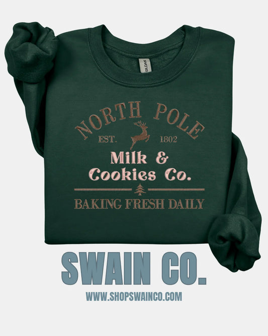 North Pole Milk & Cookies Embroidered Christmas Sweatshirt | Holiday Baking Crewneck | Fresh Baked Daily Embroidery | Cozy Christmas Gift for Her