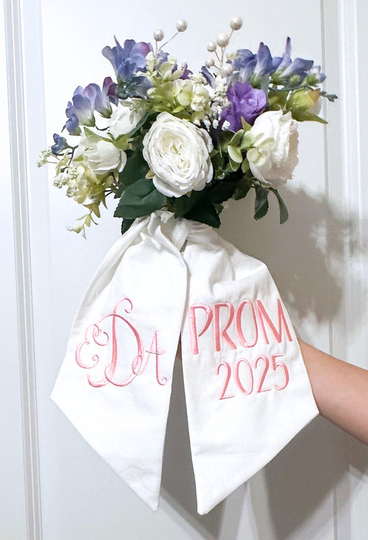 Prom Bouquet Embroidered Sash | Personalized Prom Flowers Ribbon | Custom Name & Date Bouquet Wrap | Senior Night Graduation Bouquet Sash Keepsake