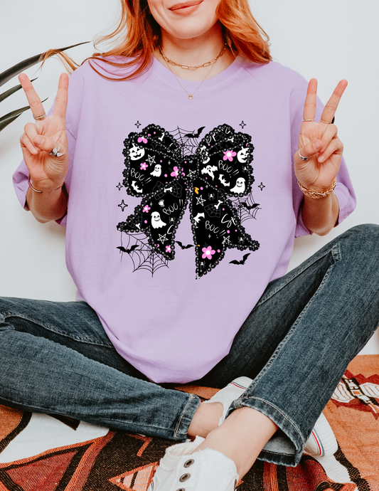 Halloween Bow T-Shirt | Lacey Black Bow Graphic Tee | Preppy Girly Halloween Shirt | Cute Ghost Bow Aesthetic | Fall Graphic Tee