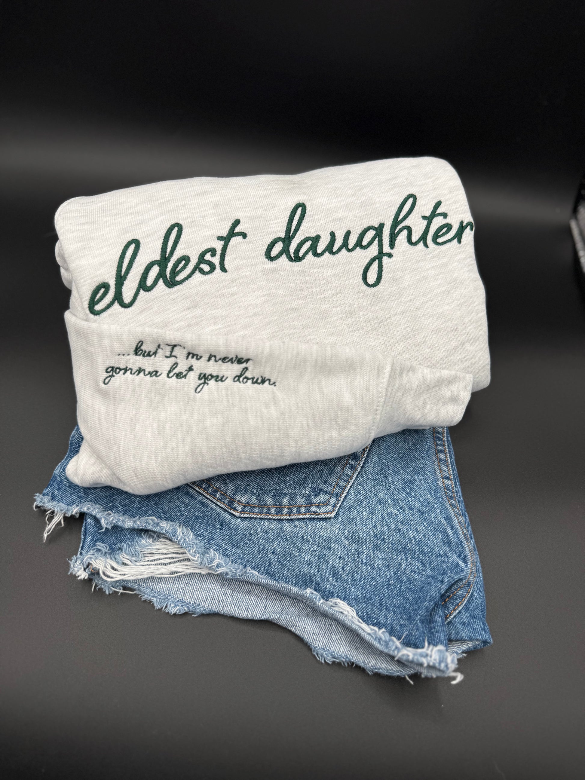 Eldest Daughter Embroidered Crewneck Sweatshirt | Taylor Swift Inspired | “But I’m Never Gonna Let You Down” Lyric Sleeve | Super Soft Bella Canvas Fleece