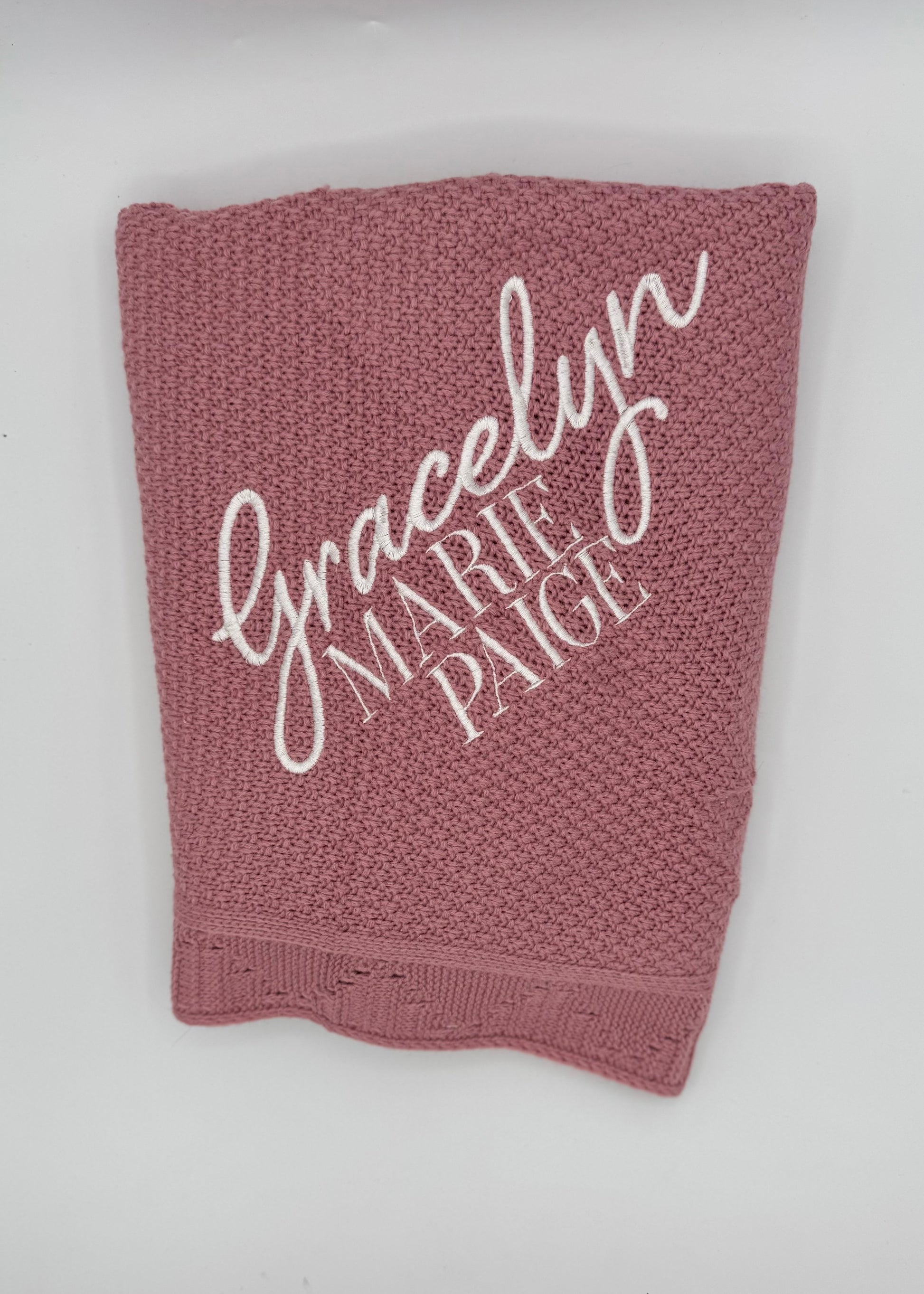 This Embroidered Knitted Baby Blanket is personalized with your baby’s name in beautiful embroidery — the perfect keepsake for newborn photos, baby showers, and everyday cozy moments.